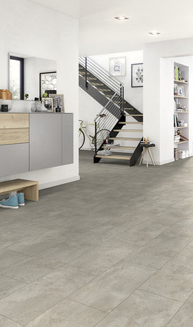 This light decor with discreet colour accents impresses with its restrained white stone look. It creates a classic and calm looking floor within the room.