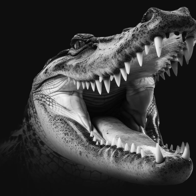 "In the shadows of the swamp, the crocodile waits, its massive jaws ready to snap, a primal force of nature, raw and unrelenting, instilling terror with each mighty lunge."